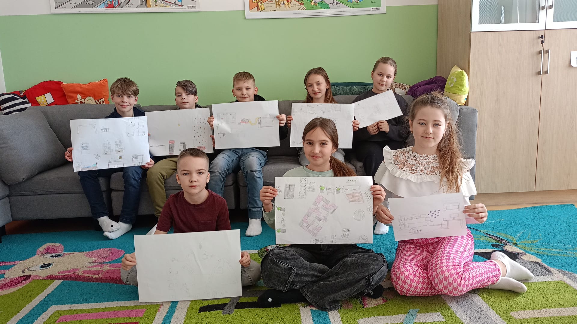 Na hodině Aj jsme se učili popis našeho pokojíčku. Slovíčka potřebná k popisu, věty s vazbou There is.... / Tam je..... Pokojík jsme si nakreslili a následně popsali.