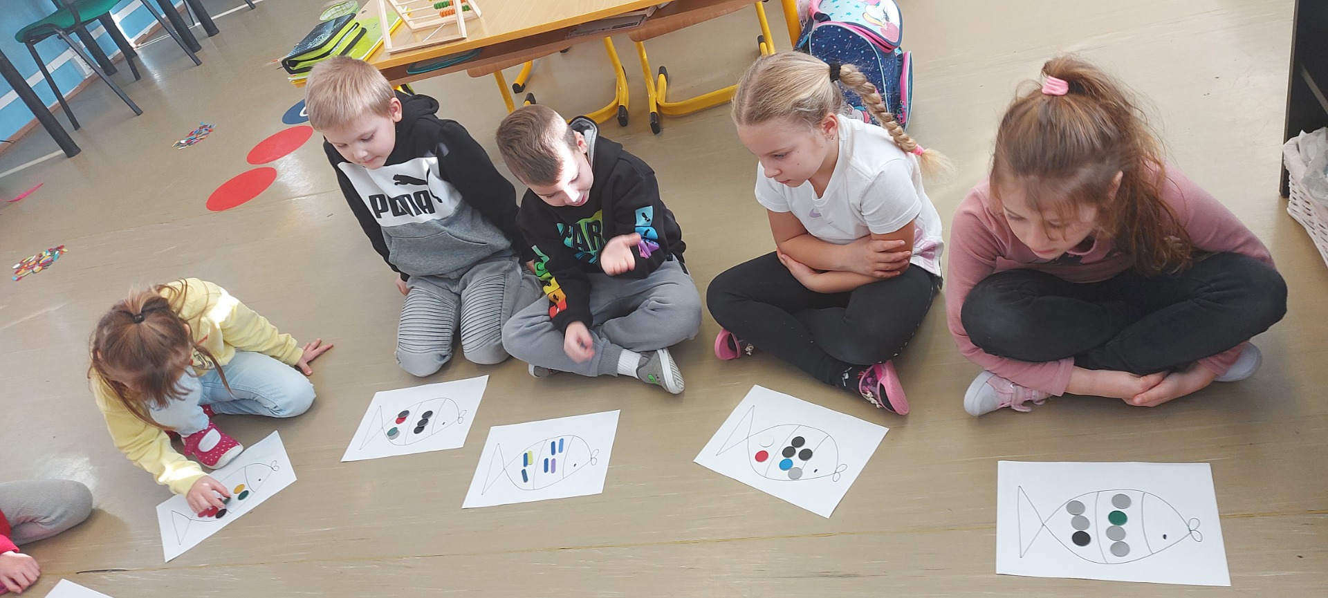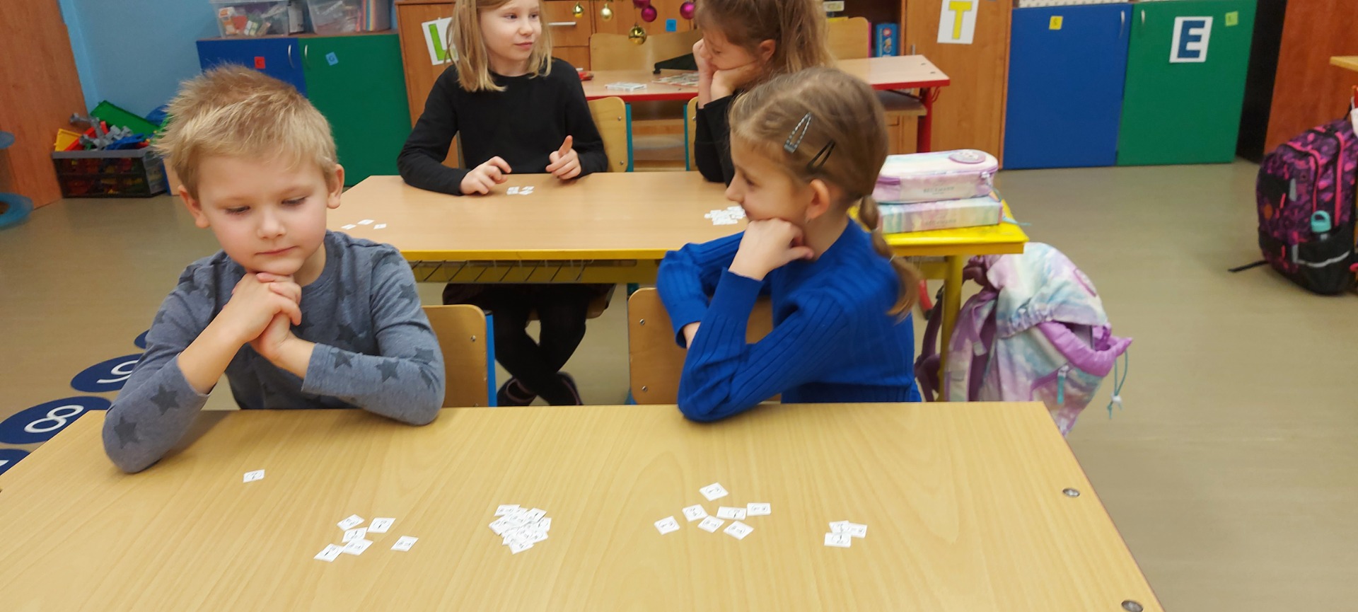 V hodinách matematiky počítáme do 8. Skládáme a doplňujeme číselné řady, porovnáváme čísla, řešíme slovní úlohy, manipulujeme s různými předměty a využíváme i počítadlo k znázornění příkladů.