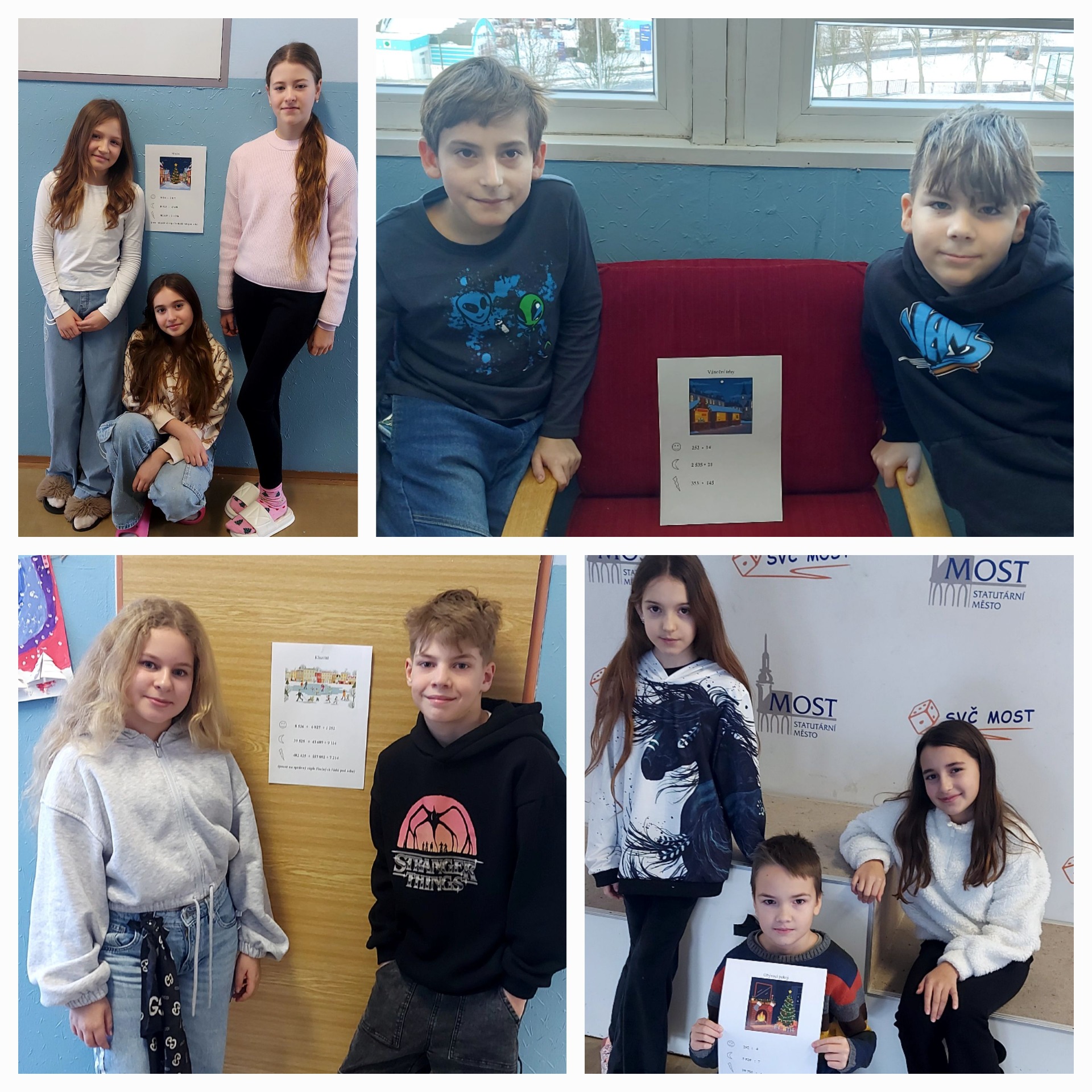 Po vánočních prázdninách jsme se ve výuce matematiky ještě na chvíli vrátili k vánoční atmosféře. Čekaly na nás čtyři gradované úlohy s vánoční tématikou, u kterých jsme si mohli sami zvolit příklady zaměřené na písemné násobení, dělení, sčítání nebo odčítání. Zvolené příklady jsme počítali do sešitu a po dokončení následovala společná kontrola. Bylo zajímavé sledovat, kdo si vybral stejné úlohy a porovnávat postupy řešení. Celá hodina byla příjemným opakováním učiva a zároveň možnost ověřit si, co už opravdu umíme.