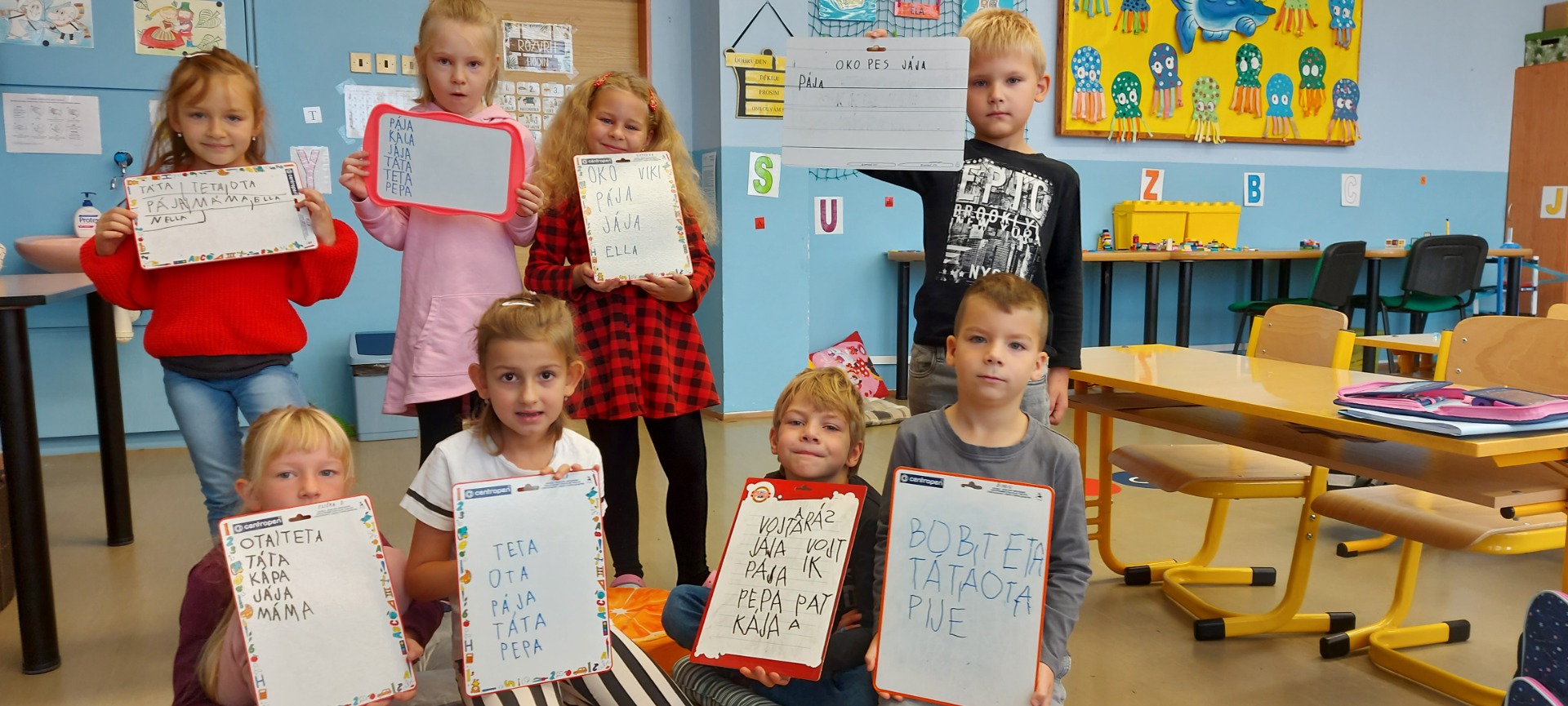 Čteme písmena a krátká slova z tabule, z kartiček, pracovních listů i sešitů, píšeme krátké diktáty písmen a slov, přepisujeme slova z učebnice, spojujeme slova s obrázkem, řešíme jednoduché křížovky tvořené ze známých písmen, začínáme číst s porozuměním.
