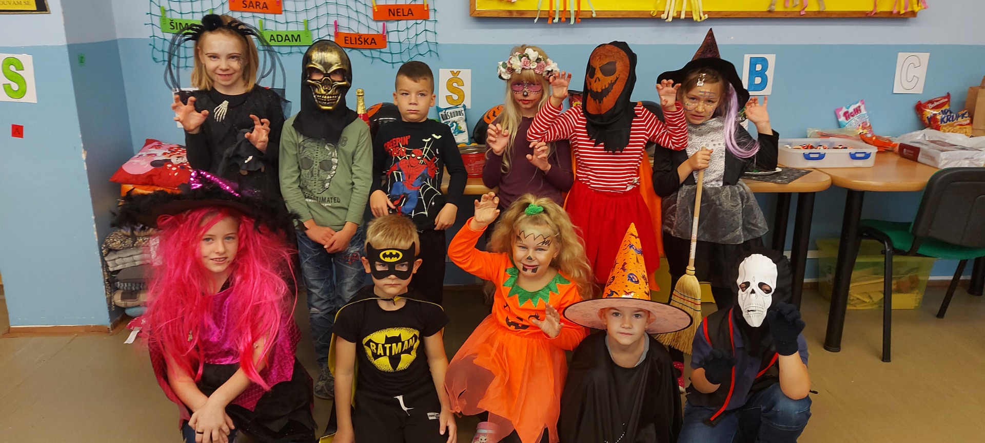 V úterý 26. 10. proběhl na naší škole projektový den Halloween. Děti přišly v krásných halloweenských kostýmech a přinesly úžasné dobroty, které připravily jejich maminky. Při našem projektovém "hraní" jsme si povídali o tom, jaký je rozdíl mezi naším svátkem Dušiček a Halloweenem. Všichni si pomáhali při zdolávání zajímavých úkolů a soutěží jako např. lovení jablíček z vody, balení mumií. Celý den se nám vydařil a skvěle jsme si ho užili.
